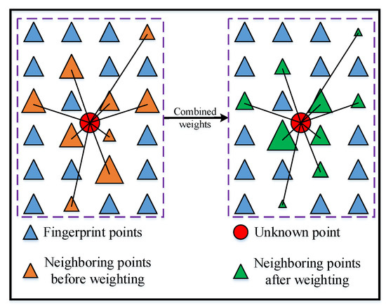 During the process of floor recognition, the user’s floor is the same as the floor with the maximum probability. During the estimate of positioning, the top K fingerprint points of maximum probability are selected as neighboring points to calculate the coordinates of the unknown point. In theory, neighboring points should be distributed around the unknown point. Taking the geometric relationship into consideration, we calculate the center of neighboring points and take the geometric distance between the center and each neighboring point as the weight factor. The larger the distance, the less significant the relationship between the neighboring point and its center, and the smaller the effect of the neighboring point on the unknown point. Neighboring points that are significantly far away from the center are removed. The coordinates of the unknown point are then calculated by combination weights of geometric distance and posterior probability of selected neighboring points. Figure 4 shows the process of combination weight determination, which is based on the following: