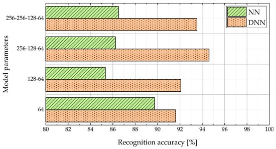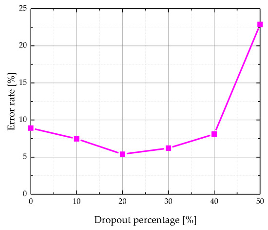 Figure 6 shows the effect of the dropout mechanism on recognition performance in the three-hidden-layer network. Dropout suppresses some neurons in the training process, reduces the model reliance on local features and enhances the generalization of the model. The figure shows that the recognition performance is highest when the dropout mechanism is at 0.2, and that excessive dropout reduces the accuracy of the model. This can be explained by noting that in a large sample model, dropout has a significant effect on restraining overfitting, while excessive dropout destroys the integrity of the model and makes it underfit with the training data.