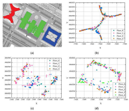 Positioning results of UJIIndoorLoc Public Dataset: (a) Building contours; (b) Building 0; (c) Building 1; (d) Building 2.