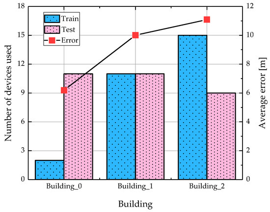 By comparing the positioning results of the three buildings, we found that the positioning accuracy differed for each building, but the positioning results for each floor in the same building were similar. These findings mainly resulted from the deviation between the training data and the test data caused by different acquisition devices [35]. This deviation is a hot spot in the field of research on Wi-Fi signals. Many researchers have attempted to study its mechanism and solution. The relationship between the number of data acquisition devices and positioning errors is shown in Figure 8. It is apparent that the fewer devices used during the acquisition of training data, the higher the positioning accuracy. But this is not the focus of this paper, and therefore we do not carry out a detailed study. In addition, the test data were obtained four months after the original data gathering, which also contributed to increase of error. Therefore, although using the data for positioning is a challenge, DNN-based Wi-Fi fingerprint location recognition is more accurate than that of the widely used RADAR system, which proves the feasibility and robustness of this method.