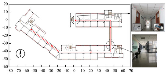 In the UJIIndoorLoc public dataset, the test data are merely simple discrete points, which cannot be used to test the positioning accuracy of user motion. Therefore, a positioning experiment was set up on the fourth floor of the School of Environment Science and Spatial Informatics, China University of Mining and Technology, Xuzhou, China. This is a typical indoor environment with 800 square meters of the experimental area. We set up 330 fingerprint points in total (1.2 m × 1.2 m) and collected 60 Wi-Fi samples at each fingerprint point, for a total of 19,800 RSS training samples. During the offline stage, we observed 195 APs. The layout of the experimental site is shown in Figure 9.