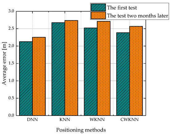 Currently, KNN (RADAR) [16], weighted KNN (WKNN) [18] and Clustering-WKNN (CWKNN) (Horus) [17] are the gold standards of Wi-Fi positioning methods. Our evaluation of the DNN performance in dynamic Wi-Fi positioning can be seen in Figure 10, which illustrates the average error of the DNN as well as that of classic methods in dynamic motion. Further, the figure also shows the changes in the positioning accuracy of different methods two months after the establishment of the fingerprint database. Without the influence of device heterogeneity, the difference between the positioning results based on the DNN and traditional methods becomes smaller, but DNN still offers better performance. Compared with KNN, WKNN and CWKNN, the average errors of DNN are reduced as follows: 20.49%, 15.68% and 13.62%, respectively. As time goes by, the positioning errors of these methods increase to varying degrees, but the DNN still has the best positioning accuracy, with an error of 2.25 m. Figure 11 shows the average time consumption of these methods for each positioning. The DNN-based Wi-Fi positioning method has the least time consumption since there is no need to cluster and calculate the Euclidean distance of signal strength between unknown and all fingerprint points. Accordingly, experiments demonstrate that the DNN can not only offer better positioning accuracy and better real-time performance than the traditional methods, but also have a good time robustness.