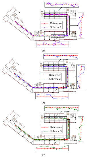 Positioning results of dynamic Wi-Fi positioning with different schemes: (a) Scheme 1; (b) Scheme 2; (c) Scheme 3.