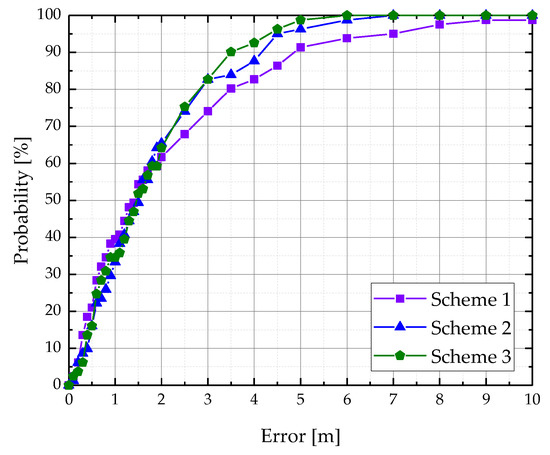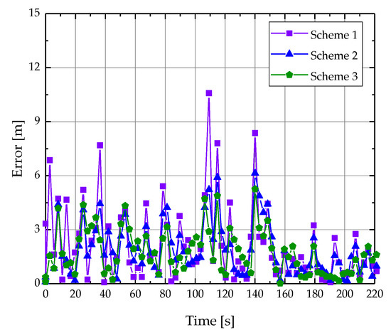 Figure 13 and Figure 14 show in detail the positioning errors and corresponding cumulative distribution functions (CDFs). The positioning result of Scheme 1 is not stable, and there is a large error. Schemes 2 and 3 can effectively suppress the error after using the constrained KF, and the maximum error is obviously decreased. Compared with Scheme 2, the main contribution of Scheme 3 is that the adaptive mechanism can recognize the gross error when it appears and reduce its influence on the positioning results by adjusting measurement noise. The probabilities of positioning errors of less than 3.5 m for the three schemes are 80.25%, 83.95% and 90.12% respectively.