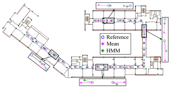 Positioning results calculated by mean and hidden Markov models (HMM).