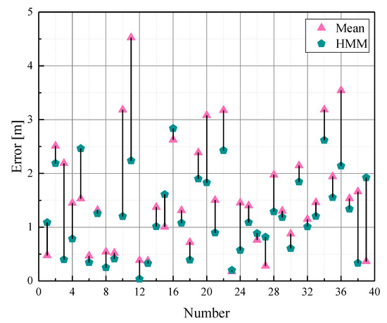 At the experimental site, we selected 39 test points at equal intervals of 5 m. Figure 15 shows the positioning situation of HMM optimal location and mean location of each test point, based on its five prior and five posterior RSS observations. Figure 16 and Table 5 show the error comparison between the two optimization methods. It can be seen that the results of the two methods are close when it comes to determining the real location, but HMM optimization has better performance. In addition, the positioning errors for HMM are fewer than that of using the mean. Compared with mean positions, the respective errors of HMM are reduced as follows: 0.36 m for average error, 0.46 m for RMSE, and 0.72 m for CEP. Accordingly, HMM optimization performs better than the mean when multiple observations are used to obtain accurate coordinates of the unknown point. However, it needs to perform multiple observations of the same point.