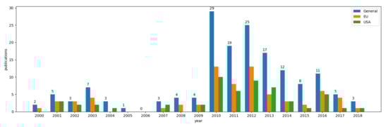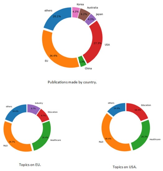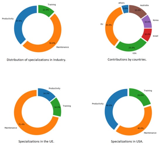 - IndustryFinally, the industry topic is analyzed in the same way as the previous topics. The summarized information can be seen in Figure 13.The information presented in Figure 13 is divided in three categories. The first and more popular one is “Maintenance”, covering 50% of the studied works: in this topic, we can find techniques to maintain factories [30,31] or aircraft [32]. The second category is “Productivity”, which is fundamental in modern industries in order to obtain better results and more efficiency in the daily industry; this can be done to help workers work with industrial robots or to even use some applications to make realistic 3D models and to share with colleagues [33,34,35]. Finally, the category “Training”, with 12.5% of the publications, covers works focused on helping workers to learn how to use their equipment [36].Figure 13 (bottom) presents the analyzed information from USA and EU. It can be observed that 71% of the EU’s works belong to the “Maintenance” category. Therefore, the “Training” and “Productivity” categories remain in second place in the EU. On the other side, USA’s works within this topic are focused on productivity and maintenance equally.Finally, Figure 13 (top right) presents the total distribution by countries. As can be seen, the EU and USA cover 60% of the publications.
