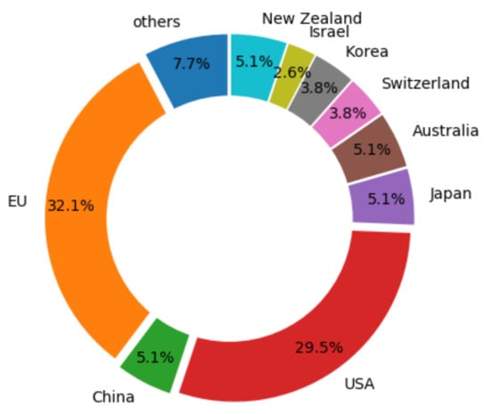 - Research and DevelopmentThis topic is the most referenced. In this field, many specializations are covered but are not going to be represented because of the multiple fragmentations that can be obtained. For example, we can observe works about integrating VR on mobile devices [13], papers about issues in AR [14], works about pose estimation [15,16], works about how to use P2P (peer-to-peer) networks to make collaborative systems for AR [17], etc.From the database used in this work, those manuscripts in which the main topic is related to research and development are divided in countries, and the results are shown in Figure 10.Although several countries are represented in Figure 10, EU and USA cover 61.6% of the publications. The remaining 38.4% is very fragmented between Asiatic and Oceania countries.