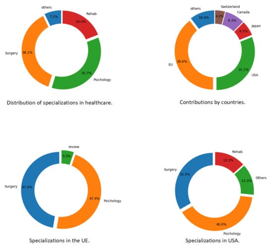- HealthcareAs we see in Figure 8, healthcare is the most popular field of application of AR and VR. First, we will analyze the topics studied.In Figure 11 (top left), it can be observed that the most relevant subtopic is surgery, followed closely by psychology and rehabilitation. In the surgery field, there are several works for helping surgeons before or during surgery [18], training for surgery in order to minimize risks [19], or even some systems to introduce students to this field. In psychology, we found papers focused, for example, on phobias [20]. In rehabilitation, most of the works are related to helping stroke patients [21,22].Focusing the attention in EU and USA regions (see Figure 11 (bottom)), the analyzed data shows that surgery and psychology are the most relevant topics: both cover almost 95% of the total publications in those regions. In the USA, psychology takes a bit more interest than surgery and rehabilitation is an important topic to be taken into account.This study is extended to all the regions around the world to compare the results (see Figure 11 (top right)). As expected, EU and USA are the regions with more contributions.