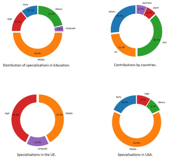 - EducationIn this section, the main attention is focused on the topic of education. The process made for the previous topic is done for this one too, analyzing the results after that. Those results are shown in Figure 12.The works related to these topics are divided in three categories: first, “Early” stage is related to works focused on the early stages of the education, up to 10 or 11 years old; “Middle” is used to denote works for high school until they are 18 years old; and finally, the category “High” is used for works applied to university studies. Figure 12 (top left) shows that the most present category is “Middle”: related to that, we can find works focused on helping students with maths [23] or science [24,25], among others. In the category “Early”, we can find works focused on teaching kids about science, too [26]. Finally, in the category “High”, works are focused on applying complex teaching techniques like collaborations [27,28]. We also found works which used AR/VR technologies to teach languages [29] in more than one category.The information obtained from Figure 12 shows that 50% percent of manuscripts found deal with working with students from middle school. Another important conclusion is that works with higher levels look more interesting than early levels (more citations).In Figure 12 (bottom), it can be observed that EU is focused mainly on the “Middle” and “High” levels but, in USA, the “Middle” education category covers 63.3% of the works while the “High” category covers less than 10%.Finally, observing Figure 12 (top right), the main regions focused on this topic are EU and USA, covering 60% of the contributions.