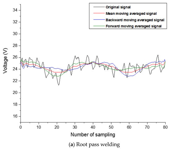 The moving average method has the advantage of changing factors to easily determine the cut off frequency, and this paper used a digital low-pass filter in the voltage signal. The forward-moving average (FMA) method is calculated in Equation (2), and the sampling number is set to a number from 1 to 80. The backward moving average (BMA) method is calculated in Equation (3), and the sampling number is set from 80 to 1 in Equation (3). After calculating the FMA and BMA, the mean value of the moving average is calculated in Equation (4), and the welding signal is shown in Figure 15.