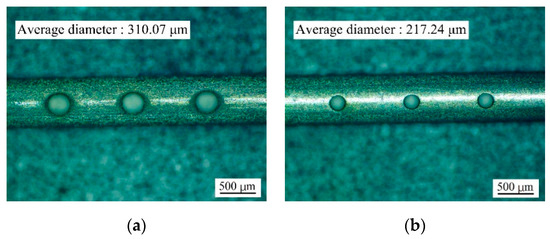 Table 4 details results of fabricated holes of different diameters. The applied voltage in the table is calculated by Equation (1) using desired diameters and a feed rate of 2 μm/s. Figure 9 shows the photographs of the holes of different diameter fabricated with the same feed rate. The manufactured tube electrode has a good surface quality and is almost free of stray corrosion, thereby showing the feasibility of fabricating variable-diameter holes by adjusting the applied voltage on-line.