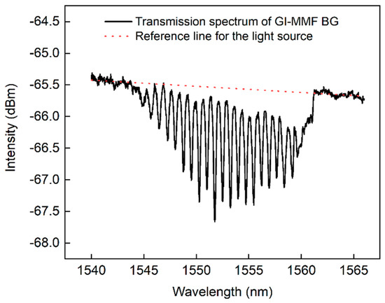 Measured transmission spectrum at a temperature of 20 °C of a BG written in OM4 GI-MMF using the phase mask technique. The red dashed line shows the reference intensity level of the applied light source.