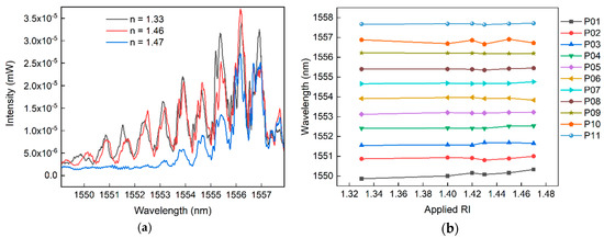 Reflection spectrum of etched GI-MMF with BG for different SRI values (a) and the response of the individual Bragg reflection peaks to different applied SRI values (b). P01–P11 indicate the Bragg reflection peaks in the reflection spectrum from left to right, i.e., the Bragg reflection peak of the highest PMG is marked with P01, whereas the Bragg reflection peak of the lowest PMG is marked with P11.