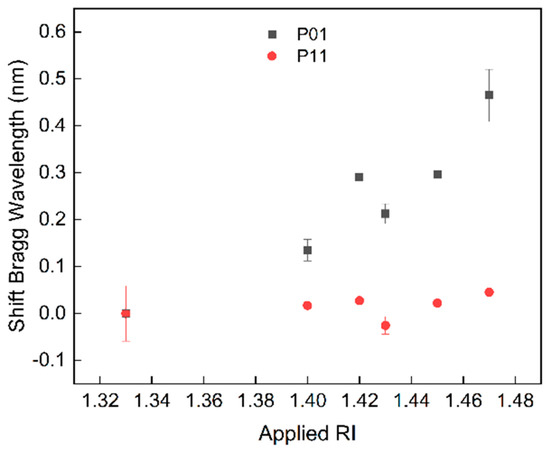 Bragg wavelength shift for the highest (P01) and lowest (P11) PMG for different SRI solutions.