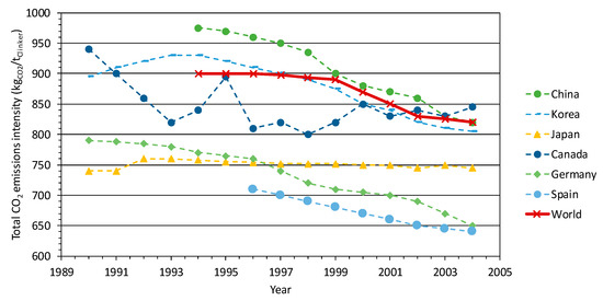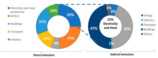 The economic sectors that most affect the direct world emissions of greenhouse gases (GHG) are the electricity and heat production (25%), industry (21%), and transport (14%). All of them represent 60% of the global direct GHG emissions (Figure 1). In particular, the effect of the electricity, heat production, and transport (39%) could be reduced by means of technological improvements (better thermal insulations, usage of the hydrogen power, fuel cells, electrical engines, and so on). Therefore, a lower contribution of these economic sectors would be expected in the near future. With regard to the industrial sector, such reduction of emissions of greenhouse gases (GHG) is a sensitive matter.