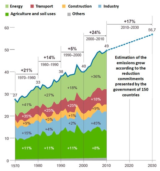 Figure 2 shows the evolution of the world emissions of greenhouse gases (GHG) from 1970 to 2010 by economic sectors. In the last decade (2000–2010), the increase in emissions attributed to industry (+45%) and energy (+36%) was higher than three quarters (+81%). These data suggest the need to implement technological measures to reduce the mentioned emissions.