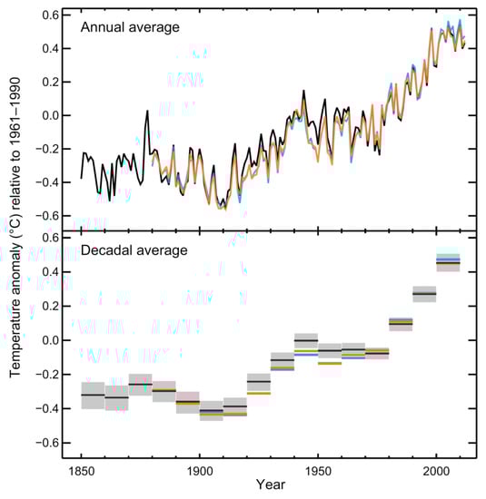 Irregularity observed in the world average temperatures on the surface, land and oceans combined between 1850 and 2012 (Reproduced with permission from The Intergovernmental Panel on Climate Change, IPCC, 2013: Summary for Policymakers. In: Climate Change 2013: The Physical Science Basis. Contribution of Working Group I to the Fifth Assessment Report of the Intergovernmental Panel on Climate Change; Figure SPM.1 (a) Observed global mean combined land and ocean surface temperature anomalies, from 1850 to 2012 from three data sets. annual mean values. published by Cambridge University Press [1]).