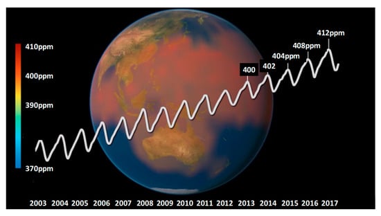 Carbon dioxide, CO2, is a gas that exists in the air in a proportion of 0.03–0.04% in volume. Figure 4 shows the way that this gas has evolved historically in the atmosphere ranging from 280 ppm in the preindustrial era to 400 ppm at the present time. Therefore, the rate at which this gas increases in the atmosphere is around 1–2 ppm/year. The data to obtain such conclusions come from ice core studies and recent air monitoring measurements. In addition, global atmospheric concentrations of methane, nitrous oxide, and other manufactured greenhouse gases have risen over the last years. Obviously, the current global atmospheric concentrations of carbon dioxide are soared to unprecedented levels compared with the last years.