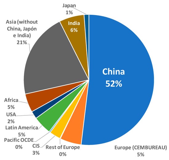In 2016, the worldwide cement production was about 4.65 Gt (Figure 5) [4], where China produced 52% and the rest of Asia produced 28.5% of the world’s production. Europe (The European Cement Association (CEMBUREAU) members) only manufactures 5.3% of the world’s cement. Several CO2 management approaches have been used in the last years in order to lower the climatic change impact and according to the project developed by the World Business Council for Sustainable Development and the Cement Sustainability Initiative (WBCSD-CSI) named “Getting the Numbers Right” (GNR), The European Union (EU28) cement industry has significantly decreased the environmental impact [5]. Table 1 shows such sharp decline from 2005 to 2015.