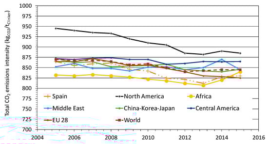 Carbon dioxide emissions per ton of clinker are approximately about 825–890 kg CO2 (Figure 6) [5], when a modern clinker kiln technology is considered. The worldwide average is about 840 kg CO2. Nevertheless, the medium-term target on carbon dioxide emission levels should be lower than 400 kg per ton of cement. Emission levels of around 350–410 kg per ton of cement have been suggested [6]. The cement industry is working hard to achieve this target by increasing clinker substitution (production of blended cements), the use of alternative fuels and raw materials, and thermal energy efficiency measures. Based on the use of the same technologies of clinker fabrication, these measures will lead to lowering the global average carbon dioxide emissions from 630 kg CO2/t cement in 2015 to around 550 kg CO2/t cement in 2050, which is far away from the target threshold level of 400 kg per ton of cement. In particular, García-Gusano et al. [7] suggested that the Spanish cement industry is able to lower the carbon dioxide emissions between 2010 and 2050 without carbon capture and storage (CCS) by only 21%. Nevertheless, for this account, carbon dioxide uptake by the mortar and concrete should be taken into account. The use of low CO2-intensity cements combined with the consideration of the carbon dioxide uptake by mortars and concretes will allow the sector to meet 550 kg CO2/ton of cement target in 2050.