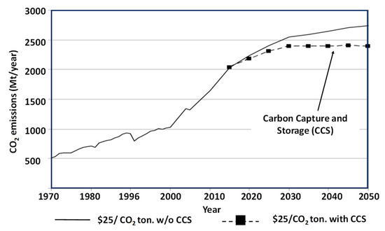 In the year 1970, 500 million tons of carbon dioxide emissions were reported by the cement industry. Carbon dioxide emissions have more than doubled during the period from 1970 to 2000. The cement industry has trebled its carbon dioxide emissions in the last 40 years (from 1970 to 2010). The prediction in carbon dioxide emissions in the coming decades will depend on the degree of implementation of carbon capture and storage (CCS) techniques in the cement sector.