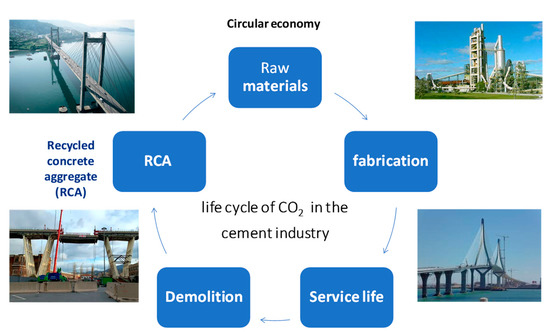 Some studies have been performed to determine the carbon dioxide uptake in order to ensure a better carbon dioxide emissions balance. For instance, a Swiss study estimated that about 9.4–10.1% of the calcination and fuel carbon dioxide emissions of the Portland cement utilized in 2010 [18] were uptake during the concrete structures’ service life. This means that about 6% of the carbon dioxide emissions coming from the calcination were uptake (considering that the ratio of the carbon dioxide emission from calcination and fuel is 60:40).