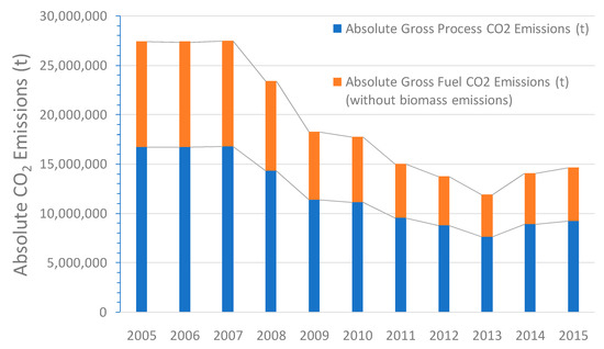 Figure 6 shows the gross carbon dioxide emissions for grey clinker from 2005 to 2015. The gross carbon dioxide emissions are the direct carbon dioxide emissions, excluding on-site electricity production, minus emissions from biomass fuel sources.