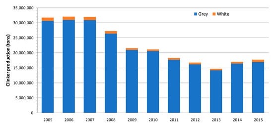 Gross carbon dioxide emissions for grey clinker from 2005 to 2015 [5].