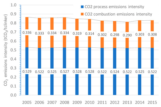 Figure 12 evidences the decrease of the carbon dioxide combustion emissions intensity from 336 kgCO2/tclinker in 2005 to 308 kgCO2/tclinker in 2015. In addition, the carbon dioxide process emissions intensity from 529 kgCO2/tclinker in 2005 to 522 kgCO2/tclinker in 2015.