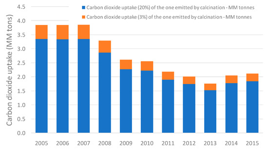 All in all, if a factor of 0.20 is applied to the CO2 calcination emissions Equation (1) (which is what is proposed in the IVL simplified methodology [26]), given that, CO2 absorption in Spanish cement manufacturing plants attributed to the service life period has been estimated at 27,358.481 tons of CO2 in the period from 2005 to 2015 (Figure 13). In a similar way, the CO2 absorption estimation during the end-of-life and secondary use was calculated by using Equation (2), and the results are also given in Figure 13.