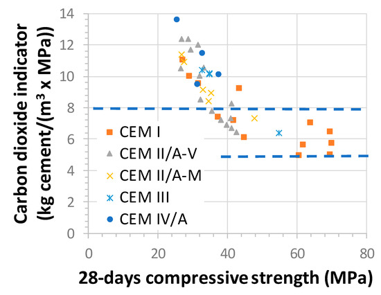 Figure 14 collects the results of the kgcement/(m3 × MPa) indicator for 40 commercial concretes made in Spain [31]. This indicator, among others, is proposed to measure the environmental impact of the construction materials [29]. The results range from 5 to 14 kgcement/(m3 × MPa). Most of the CEM I and half of the CEM II/A-V cements [28] range between 5 and 8 kgcement/(m3 × MPa). As consequence, the higher the 28-day compressive strength, the lower the carbon dioxide indicator defined as kgcement/(m3 × MPa). In addition, high-strength and high-performance concretes led to the design of slender concrete elements than using normal concrete. Given that, a lower amount of concrete is necessary. Consequently, it can be underlined that the global environmental impact of using this type of concrete is lower.