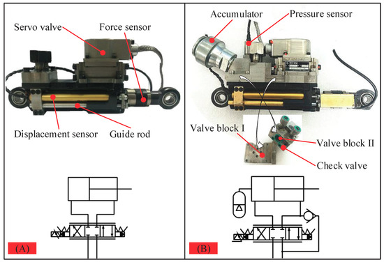 Hydraulic servo actuator. (A) Actuator with original structure and corresponding hydraulic principle; (B) hydraulic servo actuator with passive compliance (HPCA) and corresponding hydraulic principle.