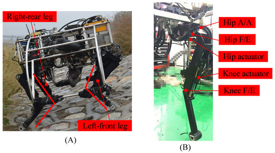 Hydraulically actuated quadruped robot SCalf II. (A) Picture of SCalf II; (B) leg structure used by SCalf II.