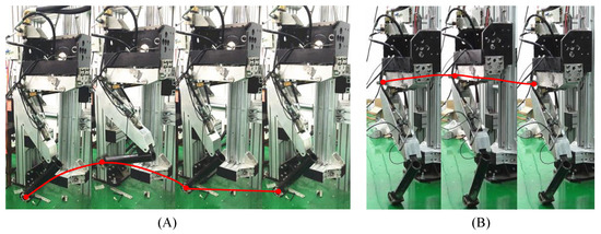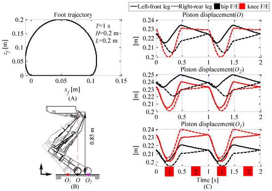 Taking the left-front and right-rear legs as examples, Figure 3 shows the foot trajectory and the motion curves of the actuators (hip F/E and knee F/E) calculated by leg kinematics [25]. The three displacement curves shown in Figure 3C use the initial points (the starting points of each gait cycle) shown in Figure 3B as starting points. The distances from points to O and to O are both 0.15 m. As can be seen from the curves, each actuator performs the same motion process in the swing phase, retracting first and then extending, while in the supporting phase, there is a big difference between the actuator trajectories at different positions, monotonous retraction or monotonous elongation.
