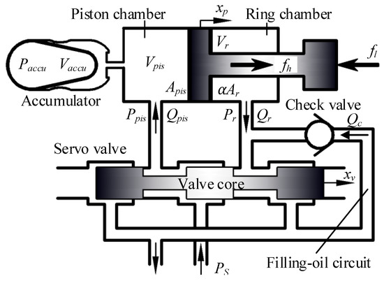 In Figure 4, P, V, A, and Q represent pressure, volume, area, and flow, respectively, and the subscripts , r, , and S denote the piston chamber, ring chamber, accumulator, and oil supply port, respectively. The area ratio can be described as . is the respective positions of the piston and valve core. and represent the initial working volume and inflation pressure, respectively, of the accumulator. The output force and load force are indicated by and , respectively. represents the flow through the check valve.