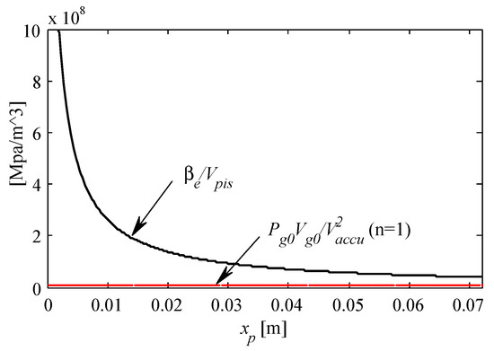 Figure 5 shows the relationship between the scale factors and that determine the rate change of the piston chamber pressure as described in Equations (2) and (6). The referenced data are shown in Table 1, among which the working volume of the accumulator is set to 25% of the initial working volume that is the minimum value allowed during normal use. Therefore, the scale factor of the HPCA can be regarded as the maximum value at each point. It can be seen from the curves that the addition of the accumulator greatly reduces the rate change of the chamber pressure, which is advantageous for reducing pressure fluctuations.