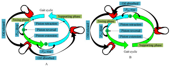 - In the supporting phase, a rather large difference in the piston trajectory exists between the actuators that drive different joints. For the same actuator, the different initial point will also cause differences. If the piston is in the process of retraction (Figure 6A), the change in direction from elongation to shortening causes the pressure in the piston chamber to be greater. For the actuator with original structure, the raised backward pressure can result in increased pressure loss in the throttle of the servo valve, so the inessential energy-loss will also increase. For the HPCA, the pressure increase due to the piston reversal is slowed down by the accumulator (as explained in Equations (2) and (6)) on the one hand, on the other hand, the oil that flows out from the piston chamber can be partially stored in the accumulator and is supplied to the next gait cycle. When the piston is in the process of extension (Figure 6B), the flow required by this process is only provided by the servo valve. The abrupt point of the chamber pressure occurs when the trajectory transitions from the support phase to the swing phase of the next cycle, and then the law described above is carried out.