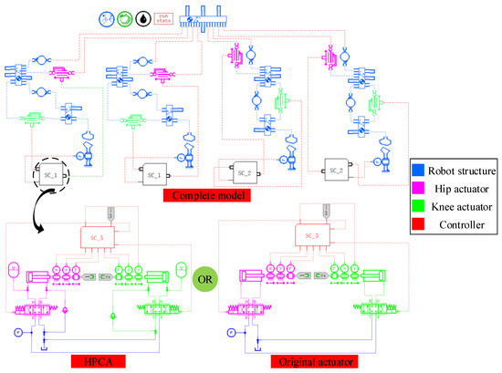 To test the energy saving of the actuator and find some rules for robot design, a simulation was carried out in the advanced modeling environment for performing simulation of engineering systems (AMESim) [32]. The mechatronics-hydraulics-integrated model of the SCalf II is shown in Figure 7. Since the keystone of this paper is the energy efficiency of the actuator, the attitude adjustment of the robot is not considered, and the Planar Mechanical Library (the components marked with blue) can be used to build the mechanical system. The related structural and physical parameters were obtained by CAD software. Since the actuators are almost non-rotating over the entire stroke length, the influence of the actuators on the leg dynamics can be ignored, and the mass is dispersed to the connected components on both sides. To get a concise model, the hydraulic systems and controller of each leg are created by the supercomponents marked by black and red, respectively. The actuators and other hydraulic related components (components marked by pink and light green) can be built by the corresponding module in Hydraulic Library. The relevant components of the controllers can be obtained from the Signal Control Library. To simplify the problem and facilitate theoretical analysis, this study only discusses the situation when the initial point is at position O shown in Figure 3.