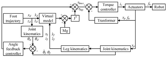 In the simulation, the compliant control method based on the virtual model (VMC) [33] was used. The desired joint torque can be established as: