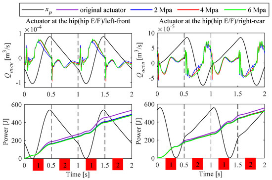 As can be seen from the flow curves (), the positive parts indicate that the accumulator, as a flow source, always supplies fluid for the piston extension, while the negative parts indicate that the accumulator, as an energy-storage unit, has been absorbing the oil released by the piston retraction. The energy consumption curves shown in the Figure 9 can be obtained by integrating the power(). The energy consumption values at each point of the piston reversal are shown in Table 3 and Table 4. It is can be seen that, for the actuator at left-front leg, the energy consumption of the original actuator increases by 148.6 J, 119 J, 148 J, and 85 J between the reversal points. But, for the HPCA, such data is around 122 J, 119 J, 122 J, and 84 J, respectively. This is consistent with the law described in Section 3.2.3, which indicates that the process of the piston from shortening to elongation can release energy. For the actuator at rear-right leg, such values are 149 J, 130J, and 149 J for the original actuator and are around 134 J, 128 J, and 134 J for the HPCA. This is also consistent with the law described in Section 3.2.3. It is worth adding that the energy released is caused by the pressure transition of the piston from extension to retraction.