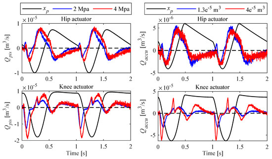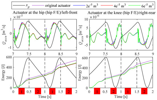 The above results prove that the HPCA does not play a role in energy conservation in the supporting phase, and in the swing phase, the energy efficiency of the actuator is not greatly affected by the initial inflation pressure and working volume of the accumulator. The explanation for this phenomenon can be summarized as follows: