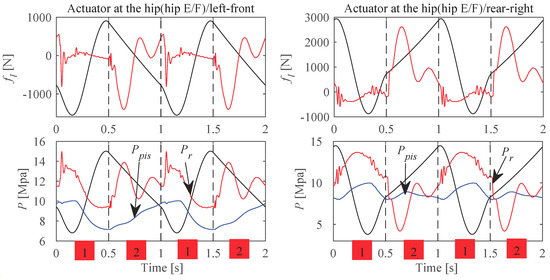Because with better representative, the simulation results of the hip actuator (hip F/E) at the left-rear and right-front legs are only shown in Figure 9. The desired trajectories ( in legend) of the actuators magnified by a corresponding multiple are used as a reference in some pictures. It can be seen from the results that, for the hip actuator at the left-front leg, the first abrupt point of the piston chamber pressure () always occurs in 0.15 s during the swing phase, and the second appears at the transition from the swing phase to the supporting phase, while for the actuator at the right-rear leg, the first abrupt point of the piston chamber pressure () always occurs in 0.35 s during the swing phase, and the second abrupt point appears at the transition from the supporting phase to the swing phase of the next cycle.