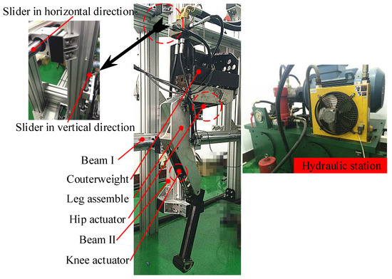 Due to limitations of devices, it is currently not possible to test the HPCA on a robot platform. Therefore, a single-leg test bench was designed to verify the simulation results. As can be seen from Figure 12, the test bench is mainly composed of beam I and II connected by slider in horizontal direction. The slider in vertical direction is mounted on the beam II and connects to the counterweight, so that the counterweight can only move in the vertical direction along beam II. The counterweight and hip are connected by bolts so that the leg can only swing in the x-z plane relative to the counterweight. According to the experimental setting, the lateral movement of beam II is limited. The total mass of the leg prototype is 45.3 kg.