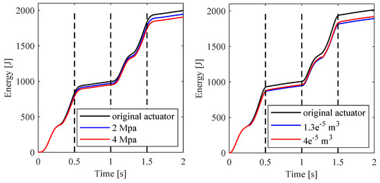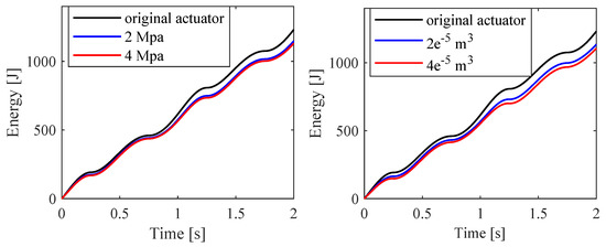 - In group 1, the initial inflation pressure of the accumulator was set to 2, 4, and 6 Mpa. The working volume of the actuator is constant (1.3 × 10 m).
