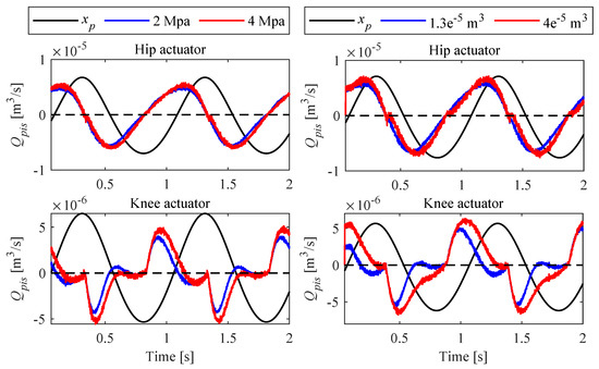 Figure 16 shows the flow curves of group 2. It can be seen that the experimental results of group 2 are similar to those of group 1. The piston movement changes from extension to retraction, the accumulator undergoes a process of storing oil, and it undergoes a process of releasing oil when the reverse change takes place. According to the test results of the hip actuator, the changes in the initial inflation pressure and working volume of the accumulator have no obvious effect on the energy consumption of the HPCA, but for the HPCA that drives the knee F/E, the results are reverse. The main reason is that the knee actuator is subjected to a greater load than the hip joint due to the topology of the leg, and to a certain extent.