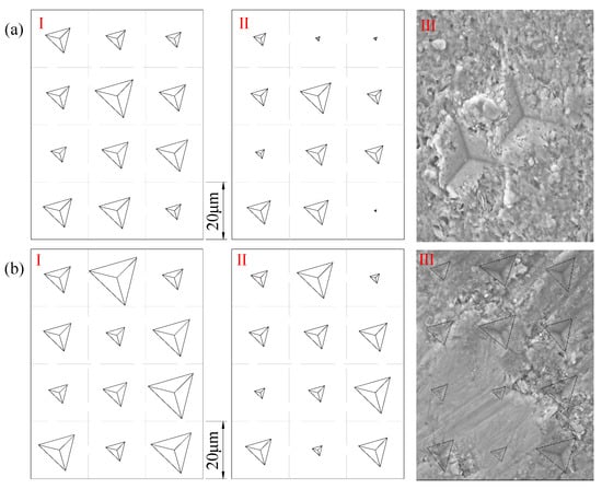 Mainly based on picture I in Figure 10a–c, the differences between the no.1 to 12 indents on the surface of shale are greater than the other two samples, which means the heterogeneous properties of shale are more differentiated than mudstone and coal. It is noticeable, however, that the indent areas obtained from the SEM (picture III) are much larger than that got from calculation (picture II). During unloading, elastic recovery causes these impressions to change their initial shape [56]. This phenomenon illustrates that the elastic recovery of the impression is not equal for the whole area, and the tip of indenter is the largest recovery position (Figure 3b), meaning that the stress under an indent varies from high levels in the vicinity of the tip, to vanishingly small values far away from it [57]. Figure 10a-III, b-III, and c-III show no obvious pile-up on the surfaces of rock and coal around the contact impression, even though they are elastic-plastic materials, which guarantees the measurement accuracy of micro hardness, elastic modulus, and fracture toughness [58].