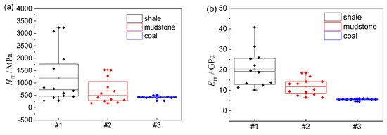 For the mean values of hardness, elastic modulus, and fracture toughness, shale has the largest ones, which are 1191.90 MPa, 20.39 GPa and 1.66 MPa·m0.5, respectively. It was followed by mudstone, with the values of 674.95 MPa, 11.72 GPa and 1.28 MPa·m0.5. Coal is softer than mudstone in a near mine [55], and its mean values of micromechanical parameters were 424.30 MPa, 5.47 GPa and 0.77 MPa·m0.5, respectively.