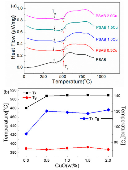 (a) Differential thermal analysis (DTA) traces; and (b) the quantitative values of glass transition temperature (Tg), crystallization temperature (Tx), and thermal stability ΔT (Tx − Tg) in a PbO-SiO2-Al2O3-B2O3 (PSAB) glass system doped with various CuO concentrations.
