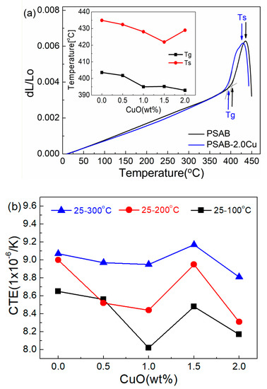 Figure 2a shows the TMA traces of the PSAB glass system as a function of CuO dopant concentration. From TMA spectra, the CTE, Tg, and softening temperature (Ts), were obtained, dependent on CuO concentration. The inset of Figure 2a showed that the Tg and Ts decreased from 404 to 392 °C and 435 to 429 °C as CuO concentration increased from 0 wt% to 2.0 wt%, respectively. Figure 2b shows the quantitative values of CTE as a function of CuO dopant concentration for different temperature ranges. As CuO dopant concentration increases, the CTE decreases from 9.07 × 10−6/K to 8.81 × 10−6/K, 9.07 × 10−6/K to 8.81 × 10−6/K, and 8.65 × 10−6/K to 8.17 × 10−6/K for the temperature ranges of 25–100 °C, 25–200 °C, and 25–300 °C, respectively.